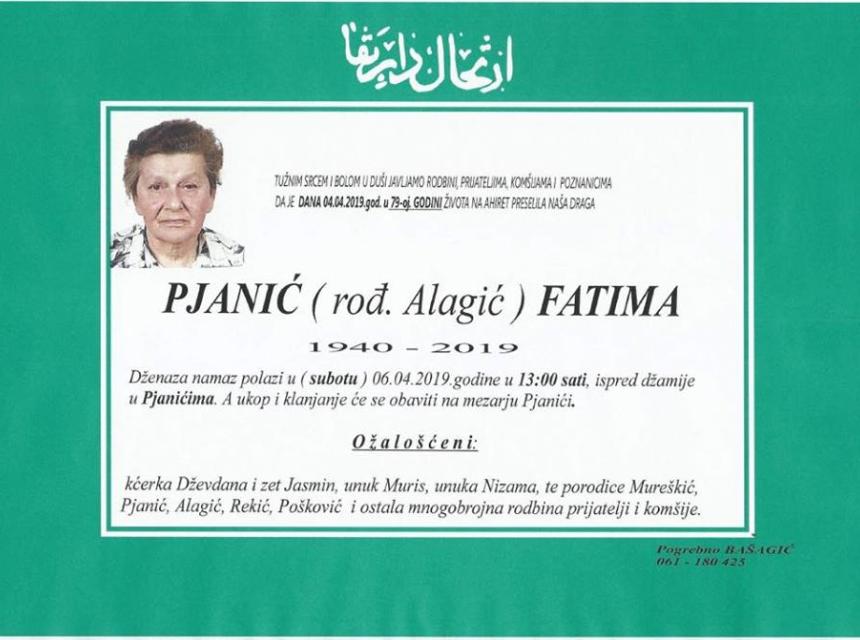 Tužnim srcem i bolom u duši javljamo rodbini, prijateljima, komšijama i poznanicima, da je dana 04.04.2019. godine u 79-oj godini života na Ahiret preselila Pjanić (r. Alagić) Fatima.