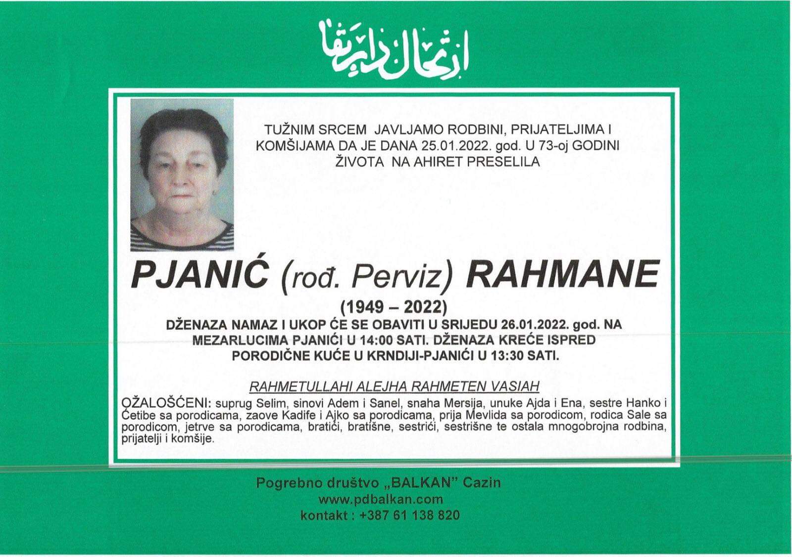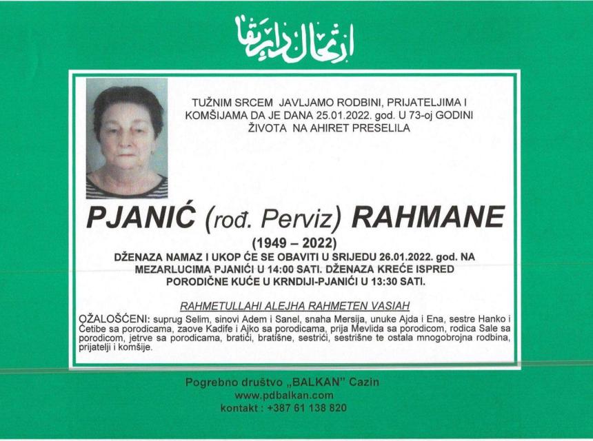 Tužnog srca i s bolom u duši obavještavamo rodbinu, komšije i prijatelje da je naša draga Pjanić (rođ. Perviz) Rahmane u 73. godini života dana 25.1.2022. preselila na ahiret.