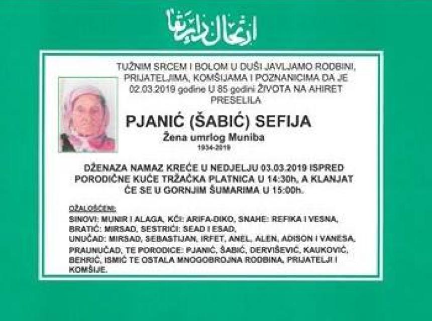 Tužnim srcem i bolom u duši, javljamo rodbini, komšijama i prijateljima, da je na Ahiret 02.03.2019.g. u 85.-oj godini života preselila Pjanić (Šabić) Sefija, žena umrlog Muniba.