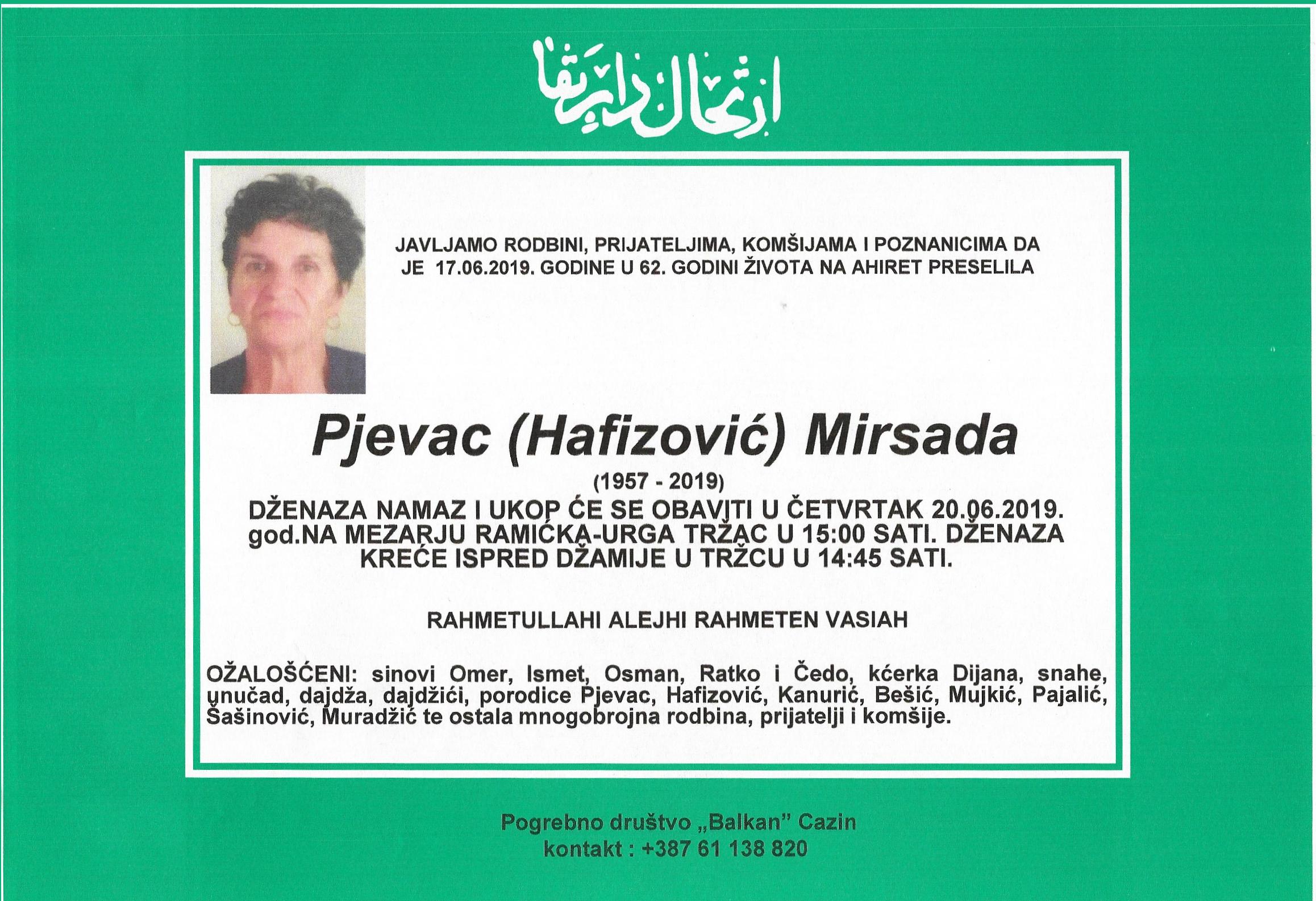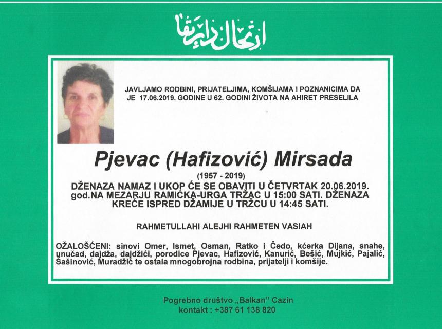 Javljamo rodbini, prijateljima, komšijama i poznanicima da je dana 17. 06. 2019. godine u 62.-oj godini života na Ahiret preselila Pjevac (Hafizović) Mirsada.