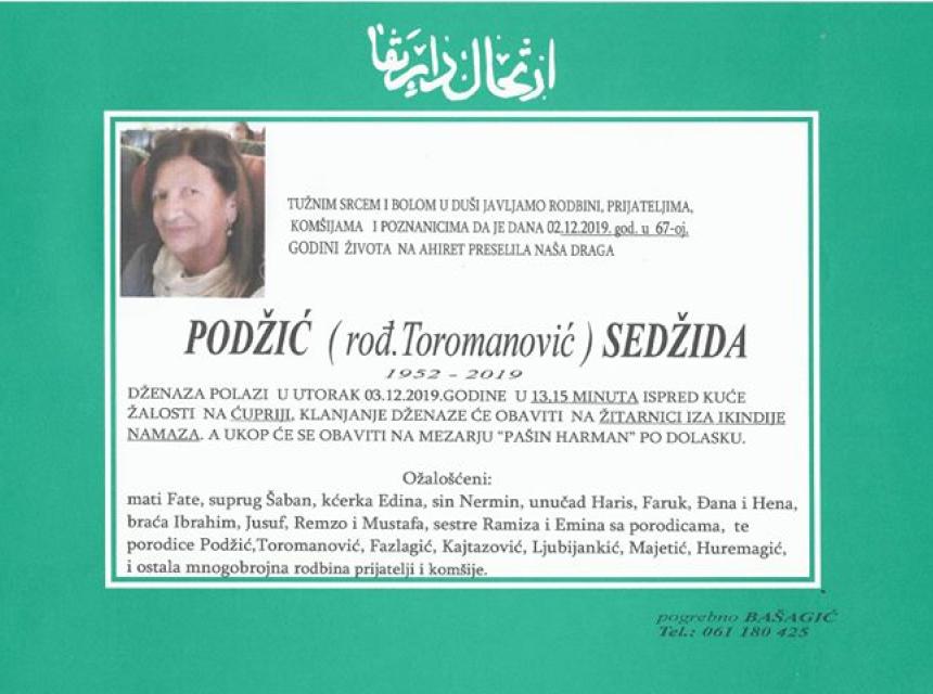Dana 02.12.2019. u 67. godini života na na Ahiret je preselila Podžić (rođ. Toromanović) Sedžida.