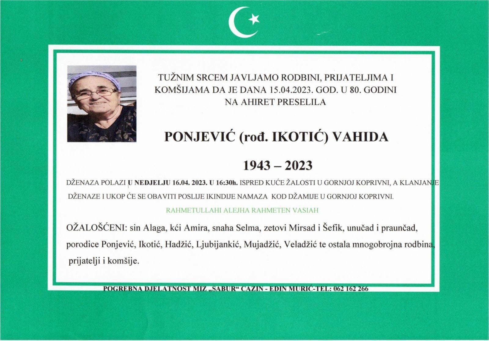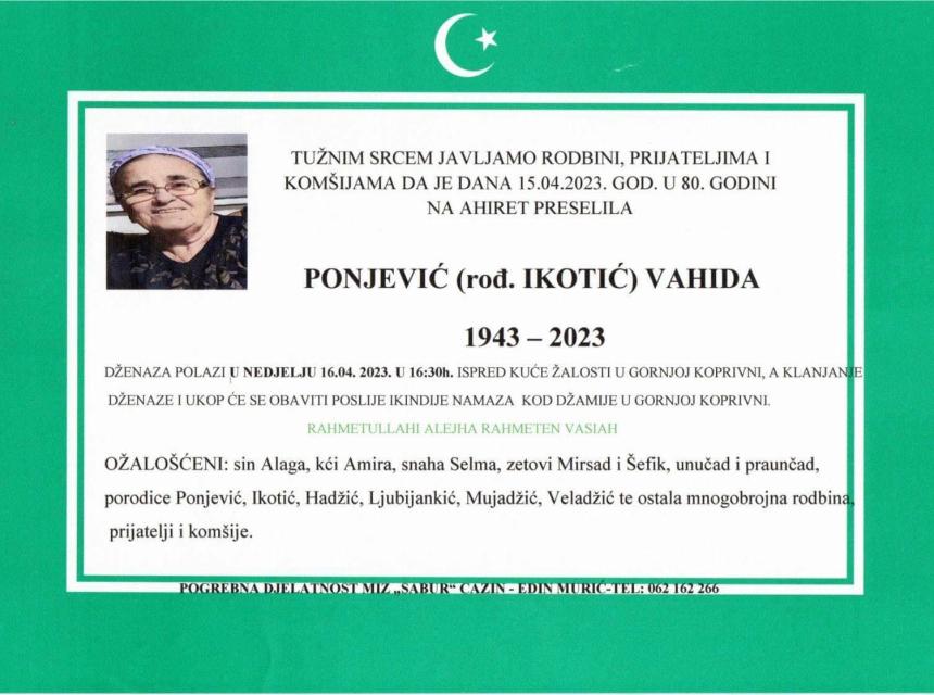 Tužnim srcem javljamo rodbini, prijateljima i poznanicima da je dana 15.04.2023. godine u 80. godini života na Ahiret preselila Ponjević (rođ Ikotić) Vahida.