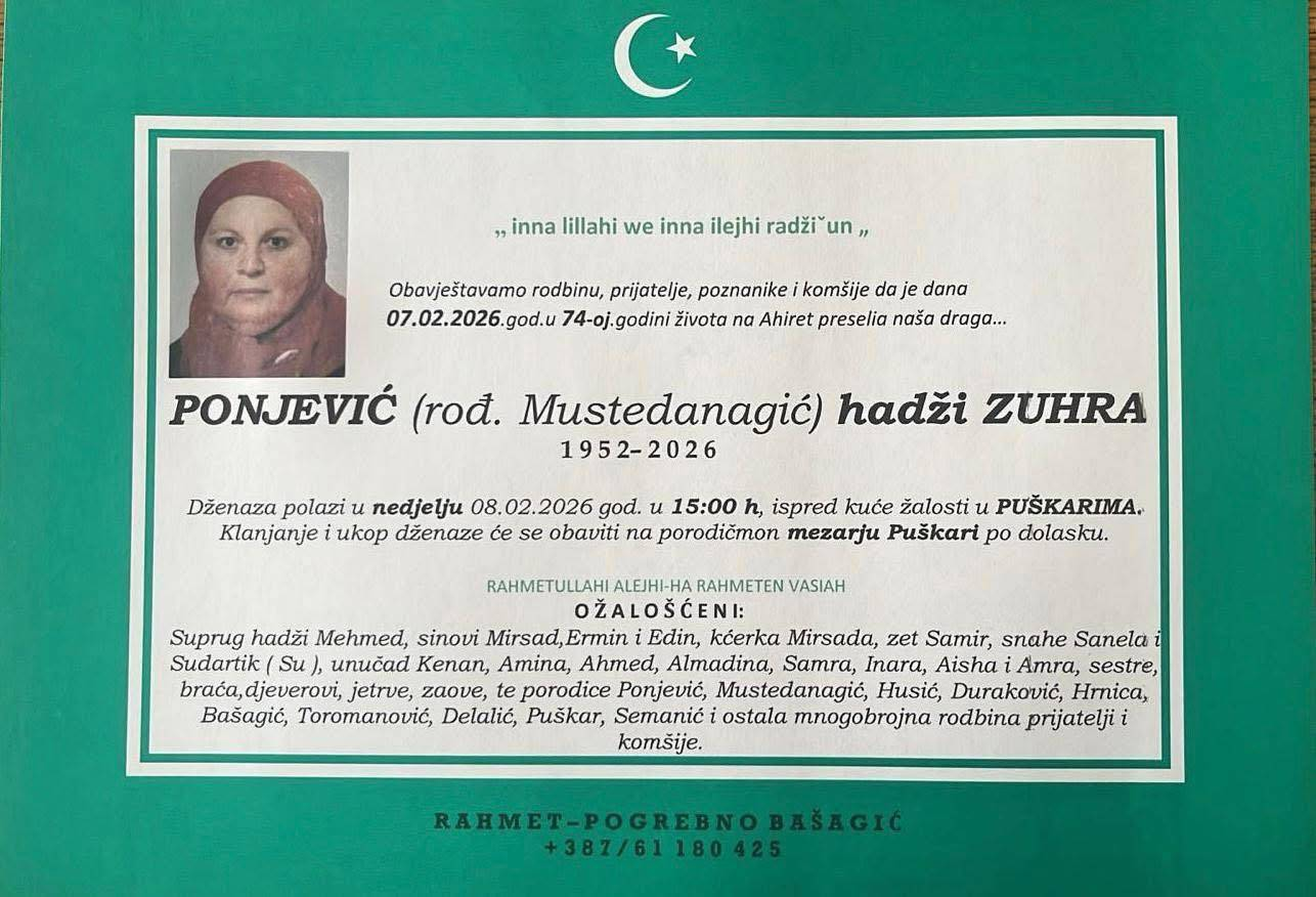Dženaza-namaz polazi ispred kuće žalosti u Puškarima, 08.02.2026. godine (nedjelja) u 15:00 sati, a klanjanje i ukop će se na porodičnom mezarju Puškari po dolasku.