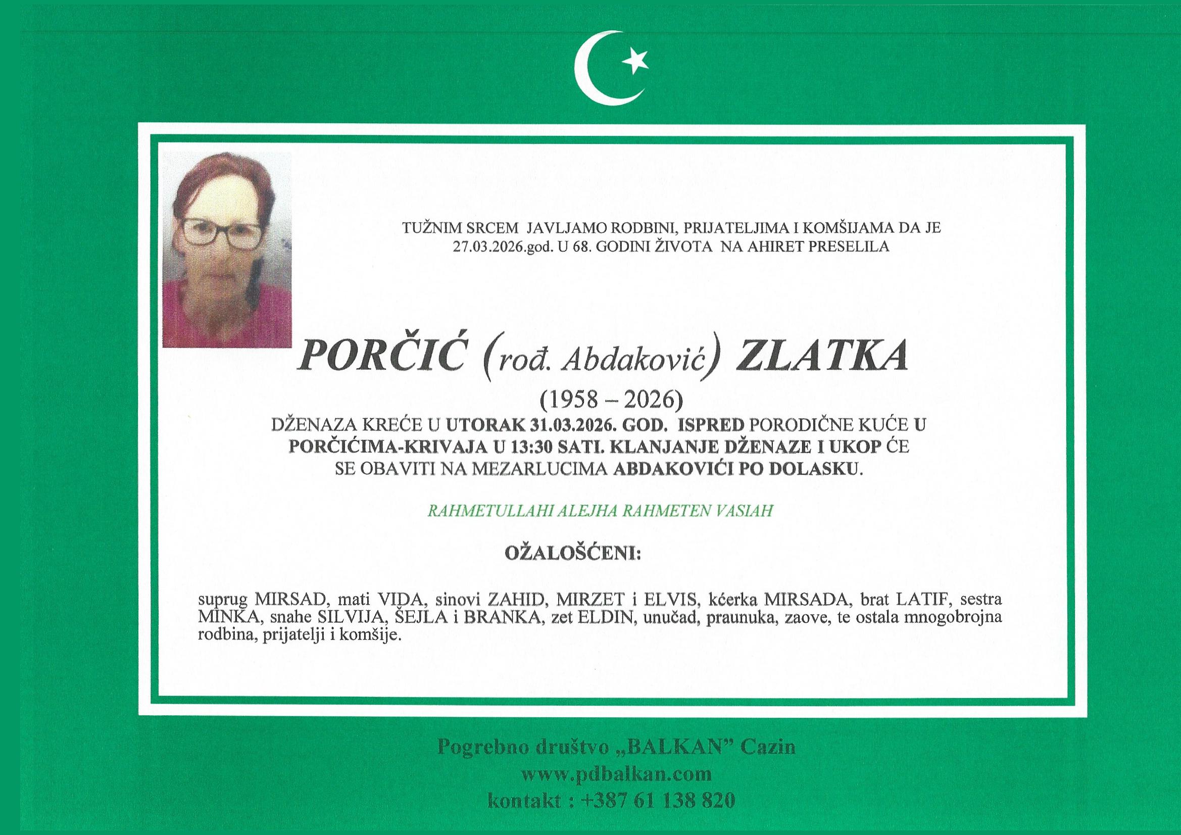 Duboko ožalošćeni obavještavamo rodbinu, prijatelje i komšije da je Porčić (rođ Abdaković) Zlatka preselila na Ahiret u petak 27.3.2026. godine u 68. godini.