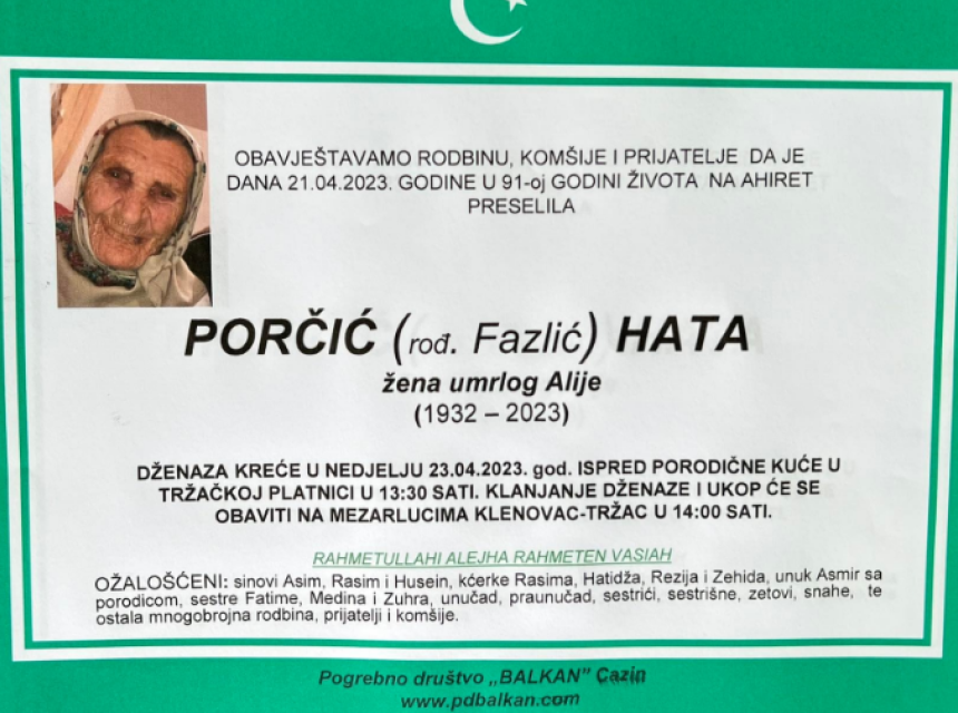 Obavještavamo rodbinu, prijatelje, poznanike i komšije da je dana 21.04.2023.god.u 91-oj. godini života na Ahiret preselila naša draga Porčić (rođ. Fazlić) Hata.