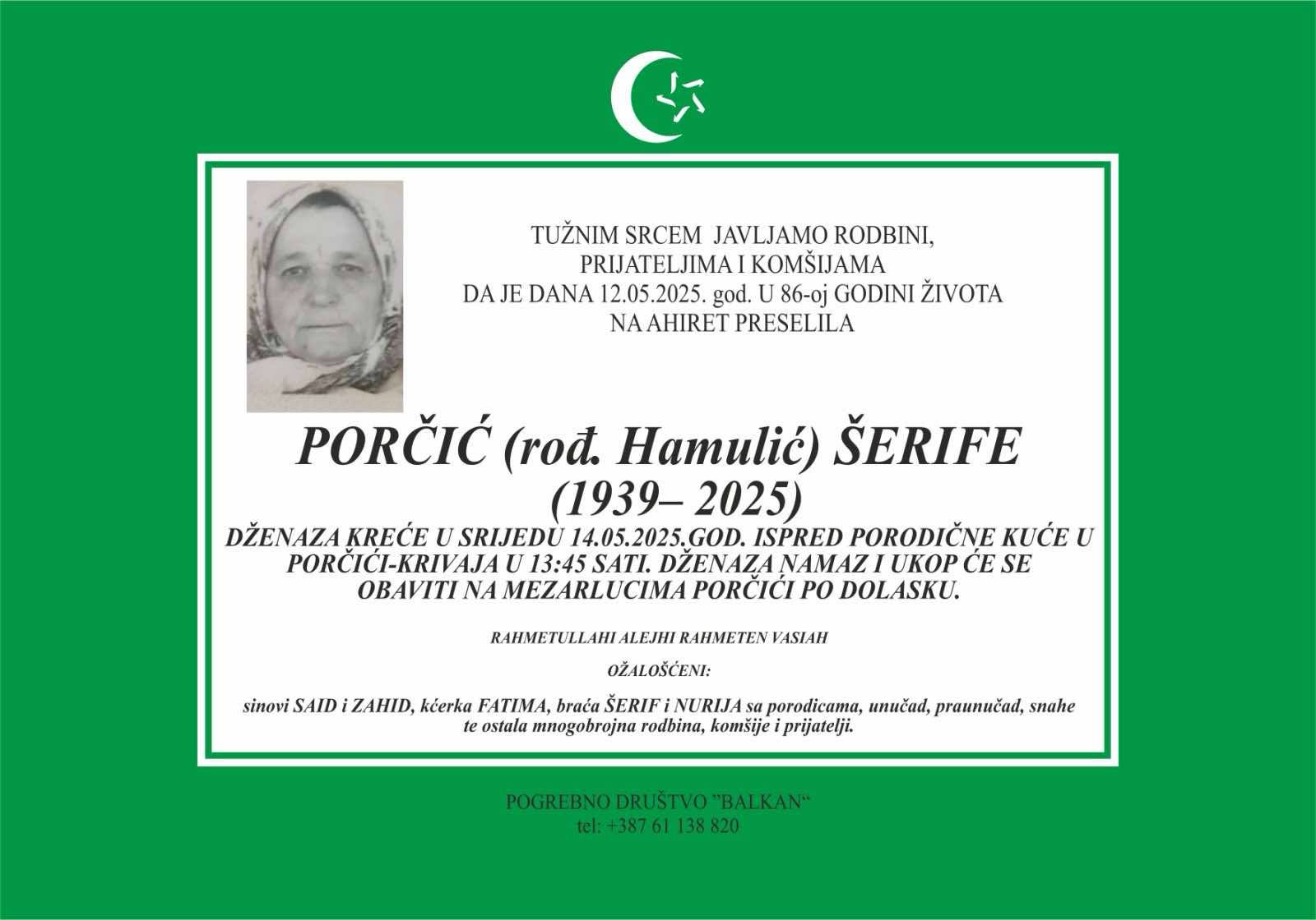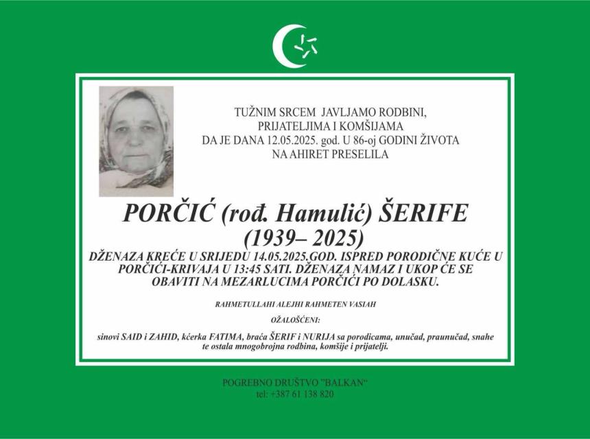 Obavještavamo rodbinu i prijatelje da je 12. maja na ahiret u 86. godini života preselila naša draga Porčić (rođ. Hamulić) Šerife.