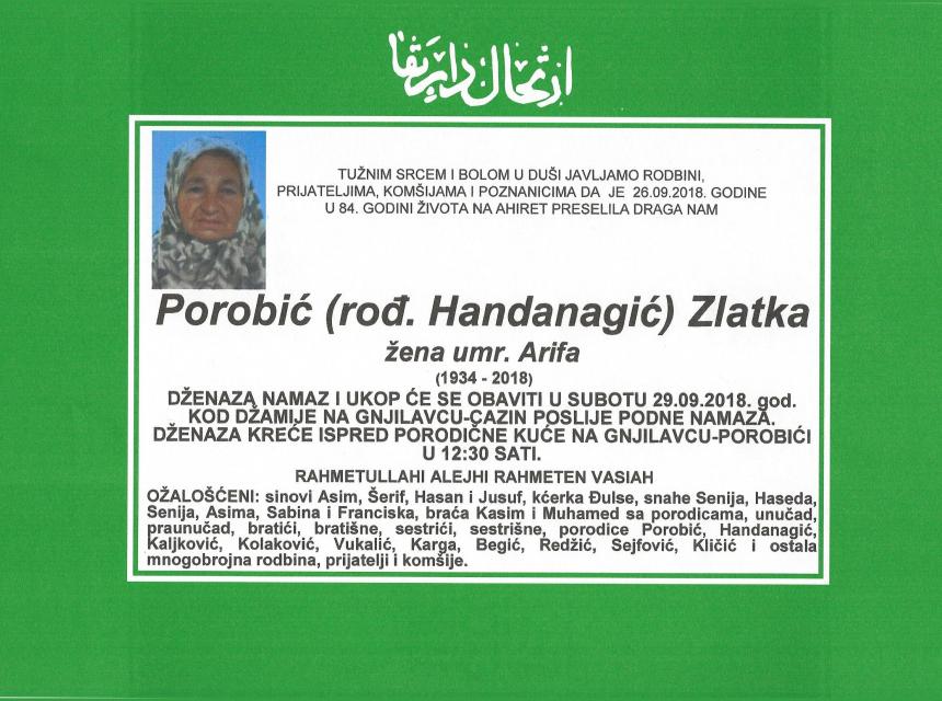 Tužnim srcem i bolom u duši javljamo rodbini, prijateljima, komšijama i poznanicima da je dana 26.09.2018. godine u 84.oj godini života na Ahiret preselila Porobić (rođ.Handanagić) Zlatka.