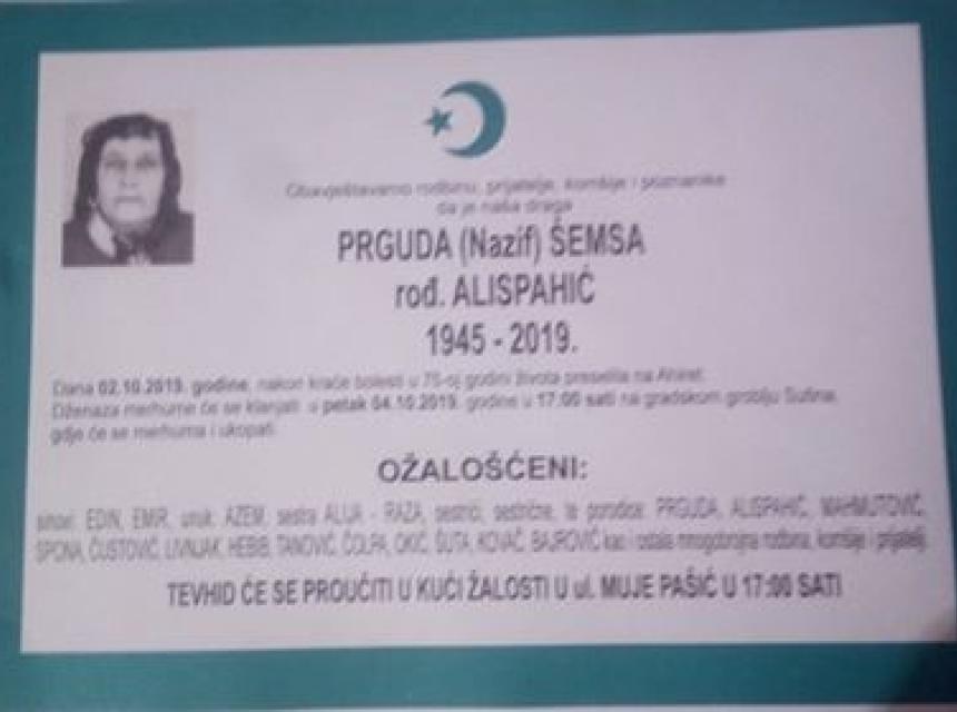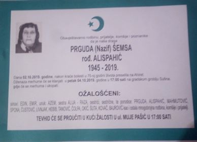 Obavještavamo rodbinu, prijatelje, komšije i poznanike da je naša draga Prguda (Nazif) Šemsa rođ. Alispahić, dana 02.10.2019. godine, nakon kraće bolesti u 75.oj godini života preselila na Ahiret.