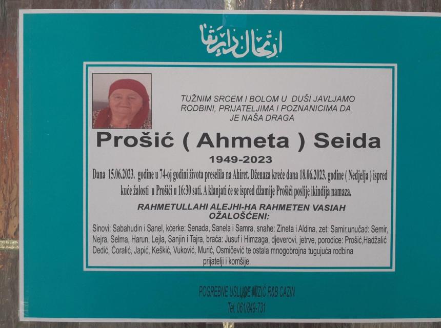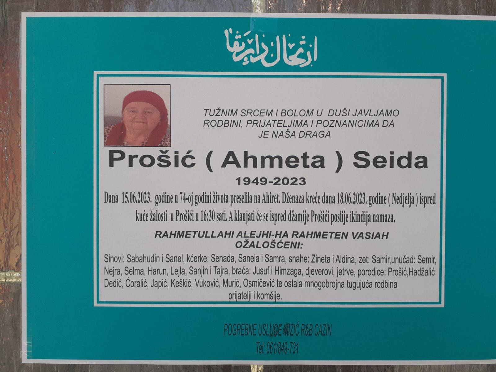 Duboko ozalosceni obavjestavamo rodbinu, prijatelje i komsije da je 15.06.2023 godine u 74. godini preselila na Ahiret nasa draga Prošić (Ahmeta) Seida