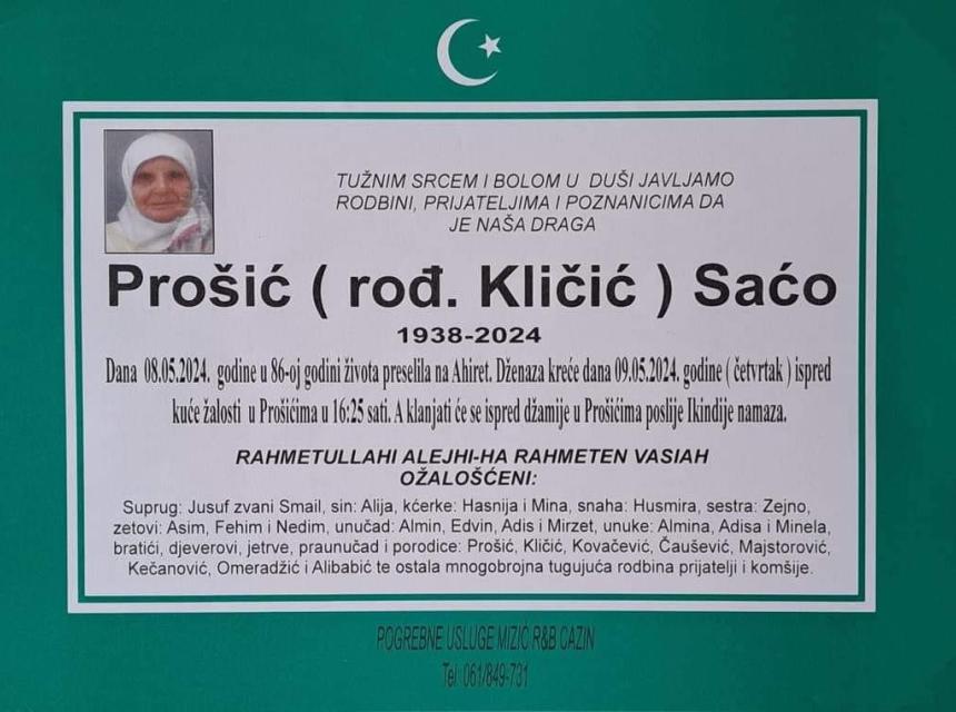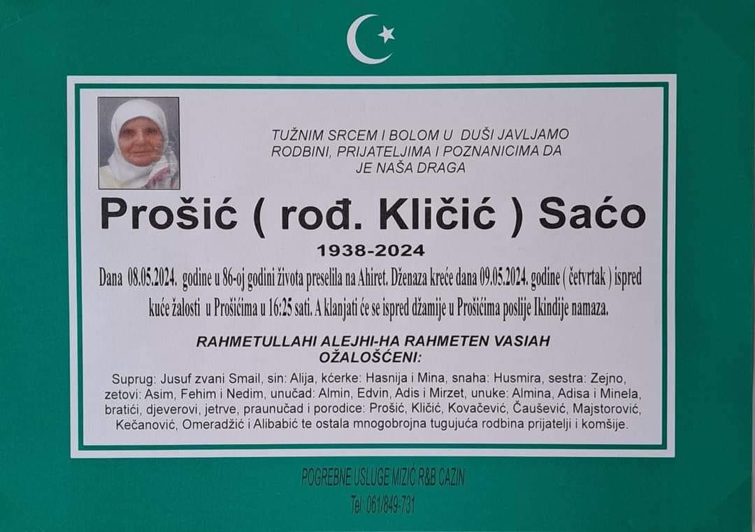 Tužnim srcem javljamo rodbini, prijateljima, komšijama i poznanicima žalosnu vijest da nam je naša draga Prošić (rođ. Kličić) Saćo dana 08.05.2024. godine u 86. godini života preselila na Ahiret.