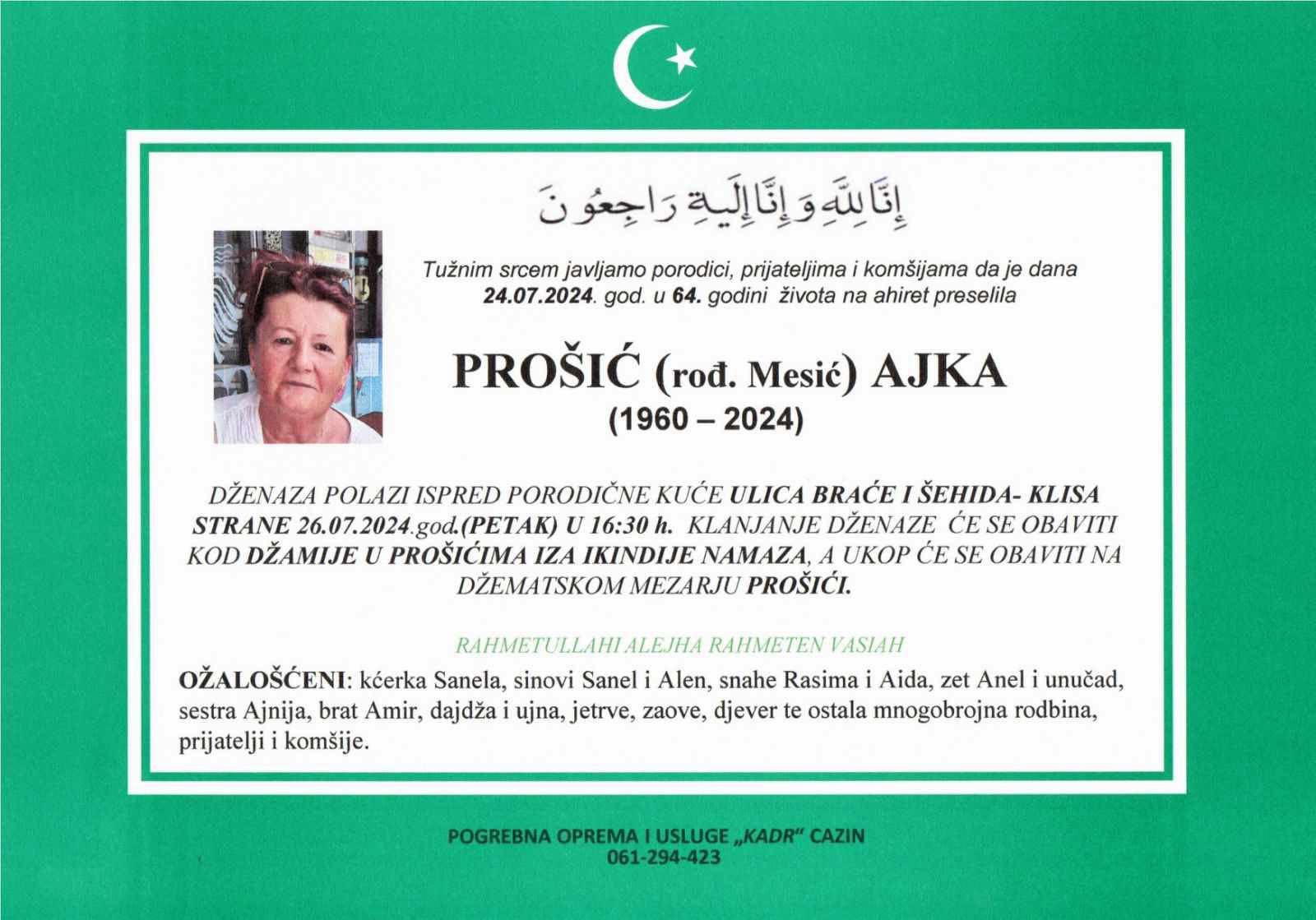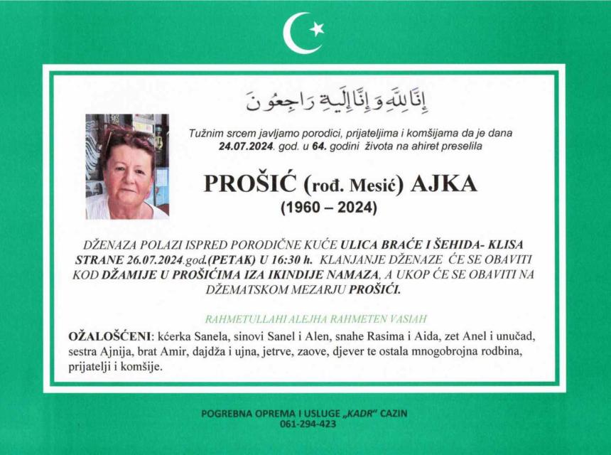Tužnim srcem i bolom u duši javljamo rodbini, prijateljima i komšijama da je dana 24.07.2024. godine u 64-oj godini života naša draga PROŠIĆ (rođ. Mesić) AJKA preselila na ahiret.