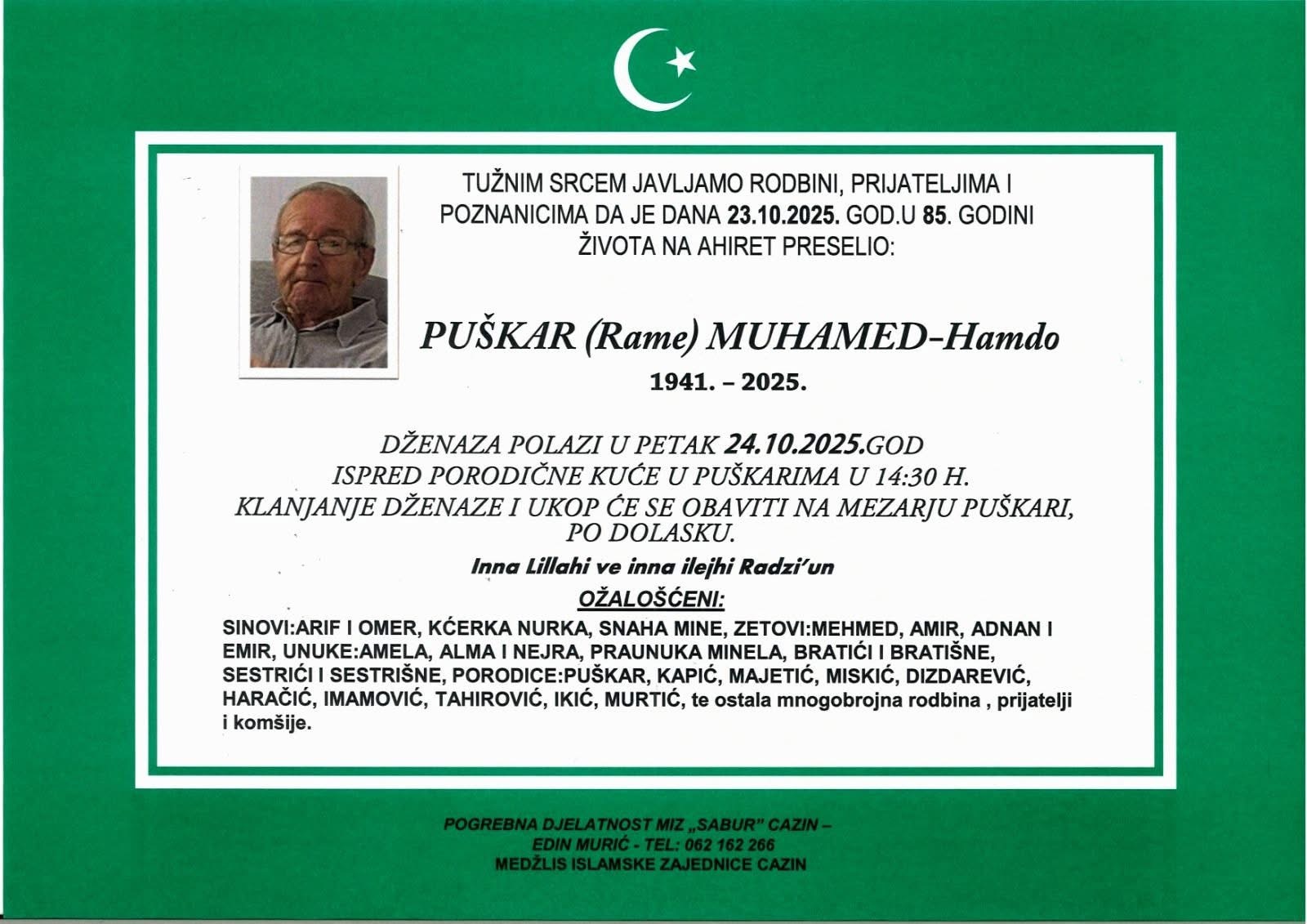 Dženaza polazi u petak, 24.10.2025. godine, ispred porodične kuće u Puškarima u 14:30 sati.