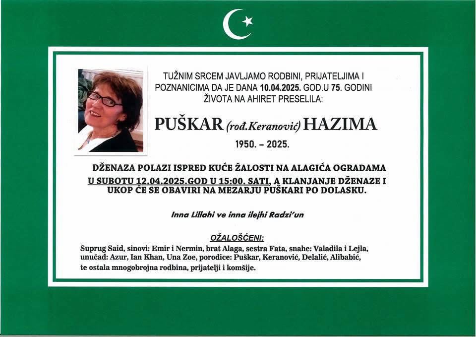 Dženaza polazi ispred kuće žalosti na ALAGIĆA OGRADAMA u subotu 12.04.2025. godine u 15:00 sati, klanjanje i ukop će se obaviti na mezarju PUŠKARI po dolasku.