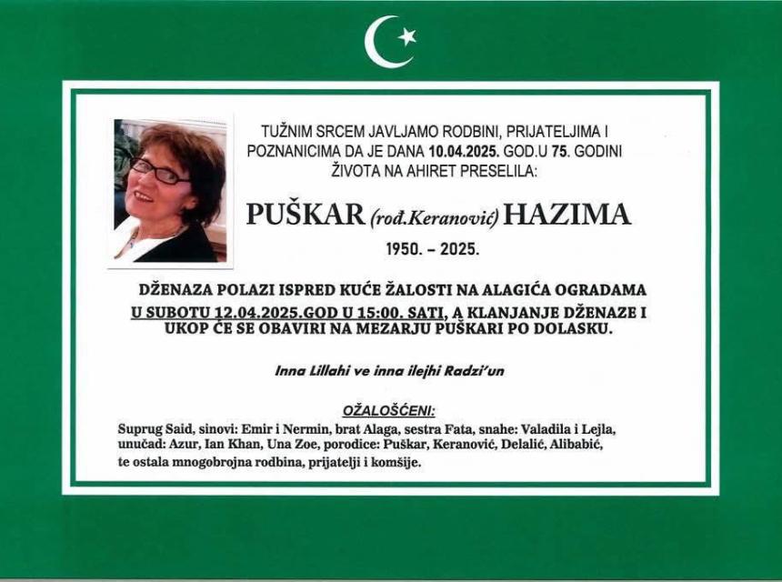 Tužnim srcem javljamo rodbini, prijateljima i komšijama da je dana 10.04.2025. god. u 75-oj godini života na ahiret preselila Puškar (rođ. Keranović) Hazima.