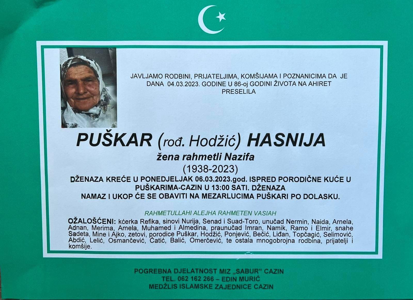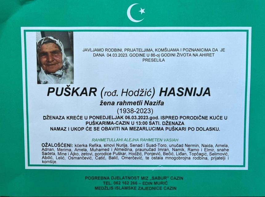 Dženaza namaz polazi ispred kuće žalosti u Puškarima-Cazin u ponedjeljak 06.03.2023. u 13:00 a klanjanje i ukop će se obaviti na mezarju Puškari po dolasku.