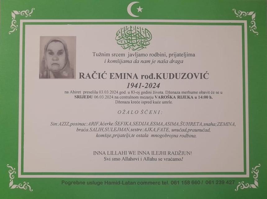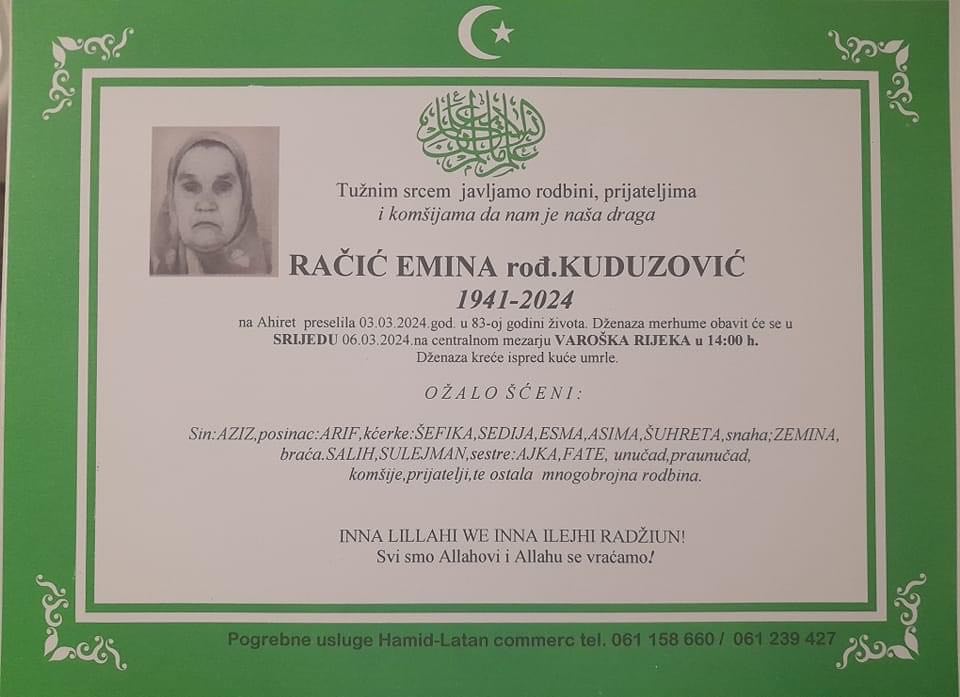 Tužnim srcem javljamo rodbini, prijateljima, komšijama i poznanicima žalosnu vijest da nam je naša draga Račić Emina rođ. Kuduzović dana 03.03.2024. godine u 83. godini života preselila na Ahiret.