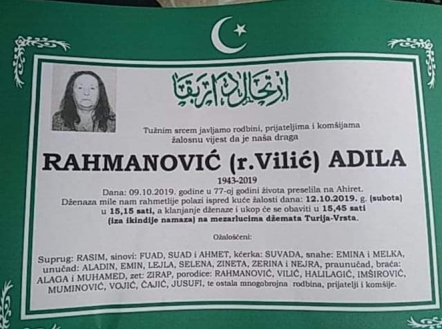 Tužnim srcem javljamo rodbini, prijateljima i komšijama da je dana 09.10.2019. god. U 77. godini života na Ahiret preselila Rahmanović (rođ. Vilić) Adila