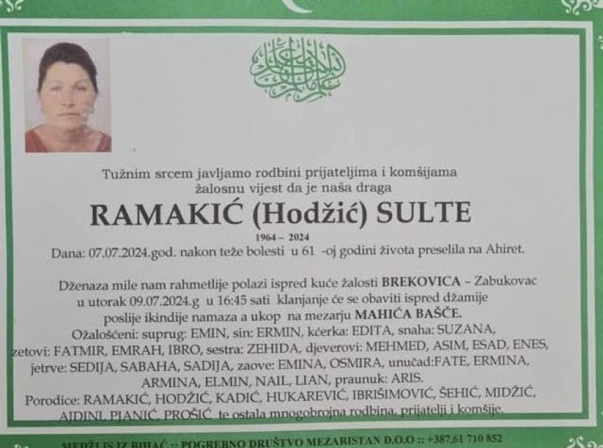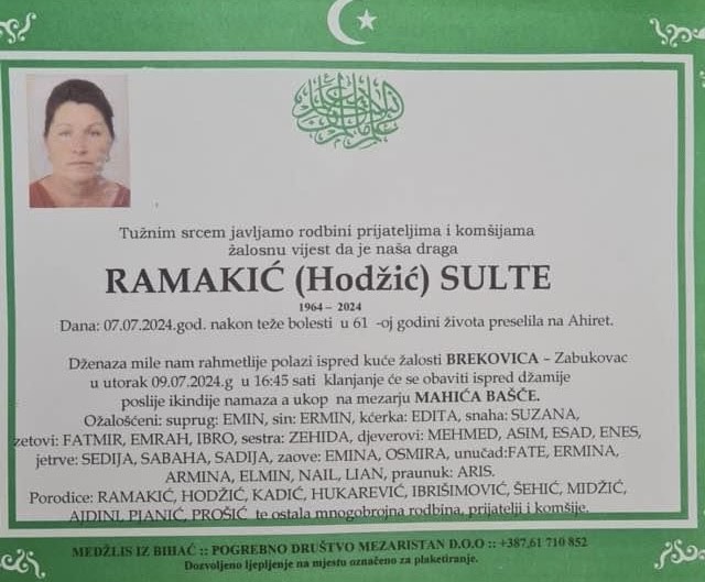 Tužnim srcem i bolom u duši javljamo rodbini, prijateljima i komšijama da je naša draga Ramakić (Hodžić) Sulte, dana 07.07.2024. godine u 61-oj godini života, preselila na Ahiret.