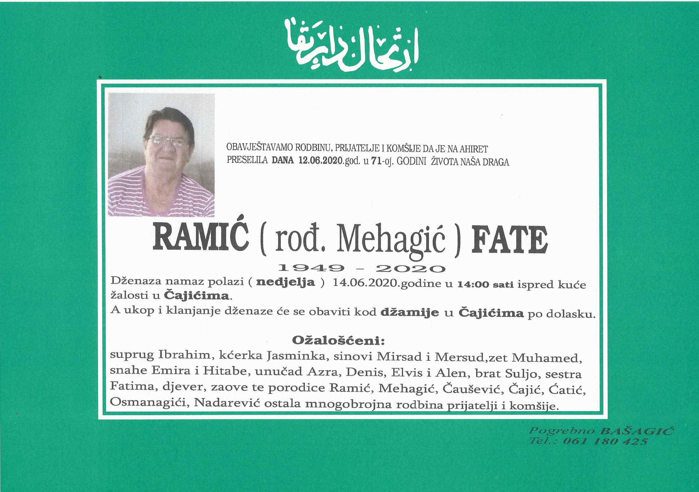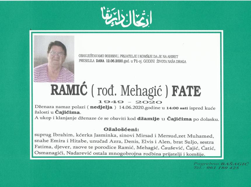 Tužnim srcem i bolom u duši javljamo rodbini i prijateljima da je naša draga i nikad prežaljena Ramić (Mehagić) Fate dana 12.06.2020. godine u 71-oj godini života preselila na Ahiret.