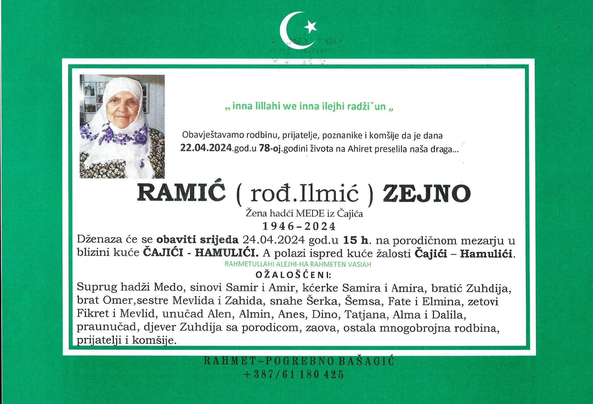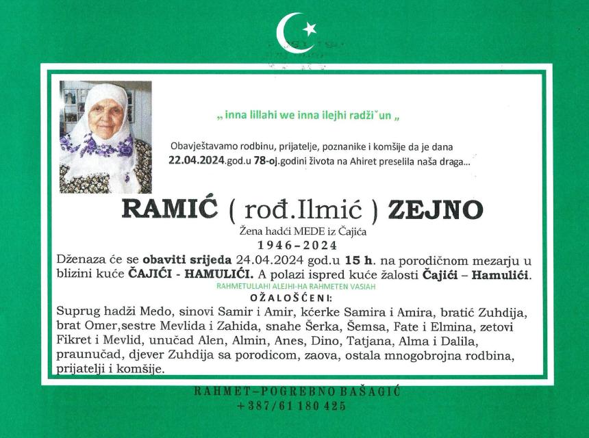 Sa tužnim srcem i žalošću javljamo rodbini, prijateljima i poznanicima da je naša draga Ramić rođ. Ilmić Zejno dana 22.04.2024. preselila na Ahiret u 78. godini života.