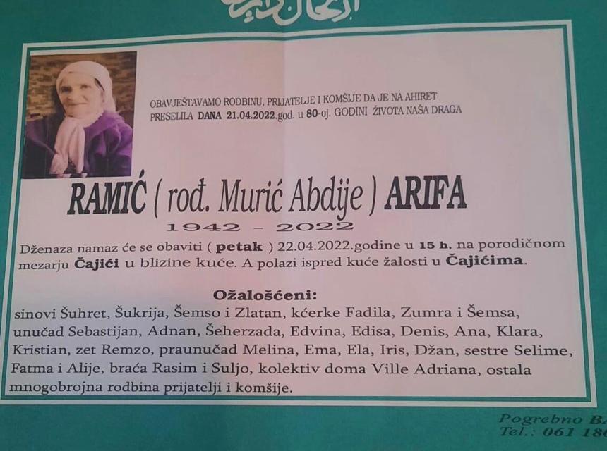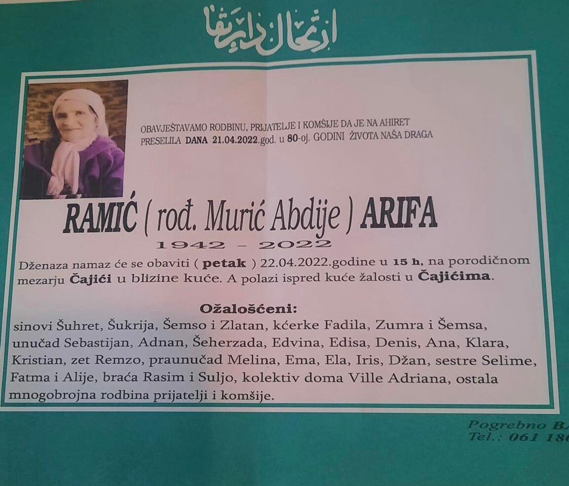 Tužnog srca i s bolom u duši obavještavamo rodbinu, komšije i prijatelje da je naša draga Ramić (rođ. Murić Abdije) Arifa, dana 21.04.2022. godine, u 80-oj godini života, preselila na Ahiret.