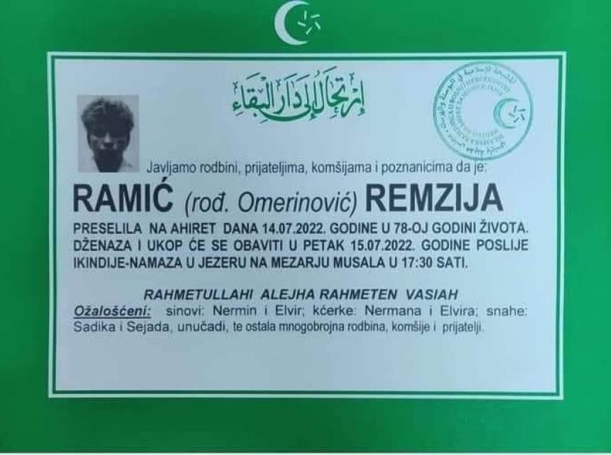 Tužnim srcem i bolom u duši javljamo rodbini, prijateljima i komšijama da je dana 14.07.2022. godine, u 78-oj. godini života na Ahiret preselila Ramić (rođ. Omerinović) Remzija .