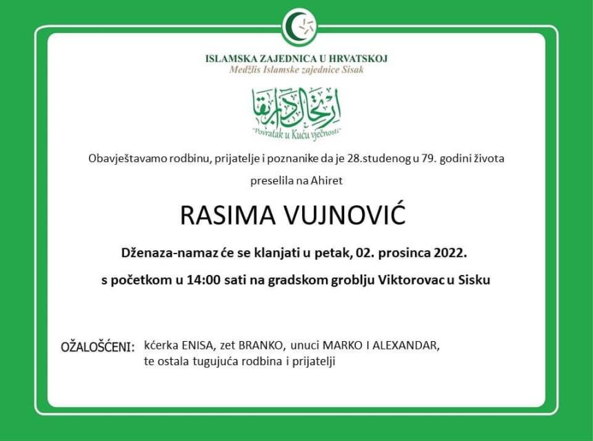 Tužnog srca i s bolom u duši obavještavamo rodbinu, komšije i prijatelje da je naša draga Rasima Vujnović u 79. godini života preselila na Ahiret.