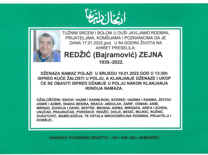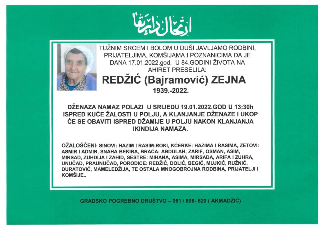 Tužnog srca i s bolom u duši obavještavamo rodbinu, komšije i prijatelje da je naša draga Redžić (Bajramović) Zejna u 84. godini života dana 17.1.2022. preselila na ahiret.