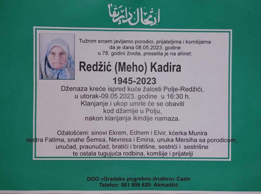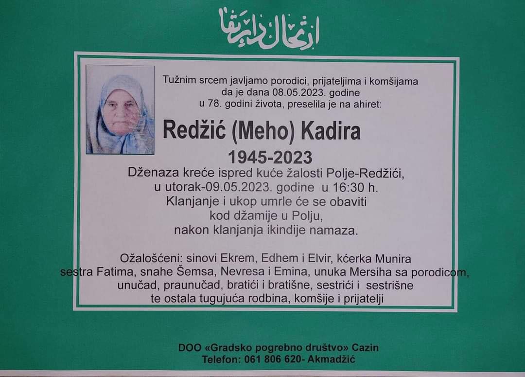 Obavještavamo rodbinu, prijatelje i komšije da je dana 08.05.2023. godine u 78-oj godini života na Ahiret preselila Redžić (Meho) Kadira.