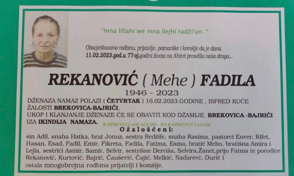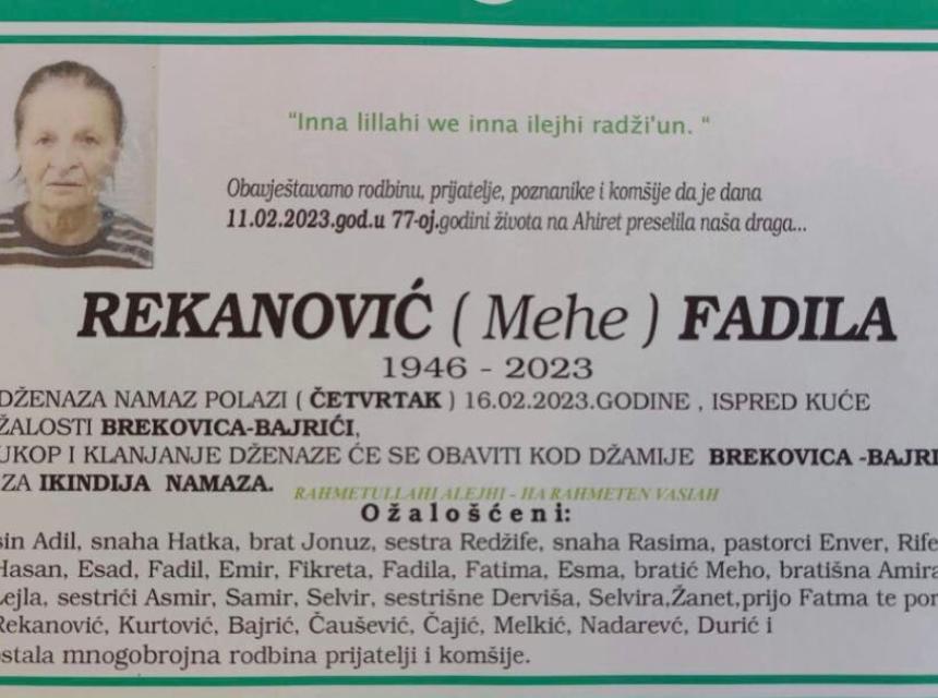Ožalošćena porodica obavještava rodbinu, prijatelje i poznanike da je u ponedjeljak 11.02.2023. godine u 77-oj godini života na ahiret preselila Rekanović (Mehe) Fadila.