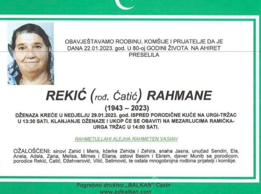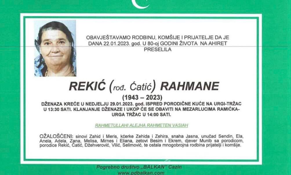 Tužnim srcem i bolom u duši javljamo rodbini, prijateljima, komšijama i poznanicima da je dana 22.01.2023. godine u 80-oj godini života na Ahiret preselila Rekić (rođ. Ćatić) Rahmane.