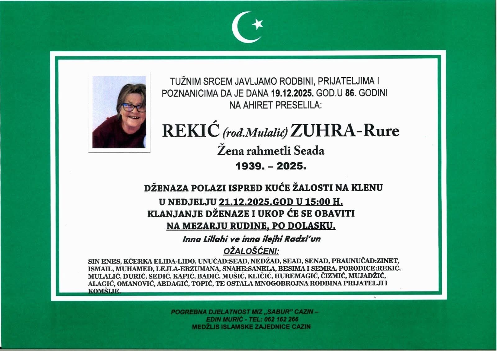 Tužnim srcem i bolom u duši javljamo rodbini, prijateljima i komšijama da je naša draga Rekić (rođ. Mulalić) Zuhra - Rure, dana 19.12.2025. godine u 86-oj godini života, preselila na Ahiret.