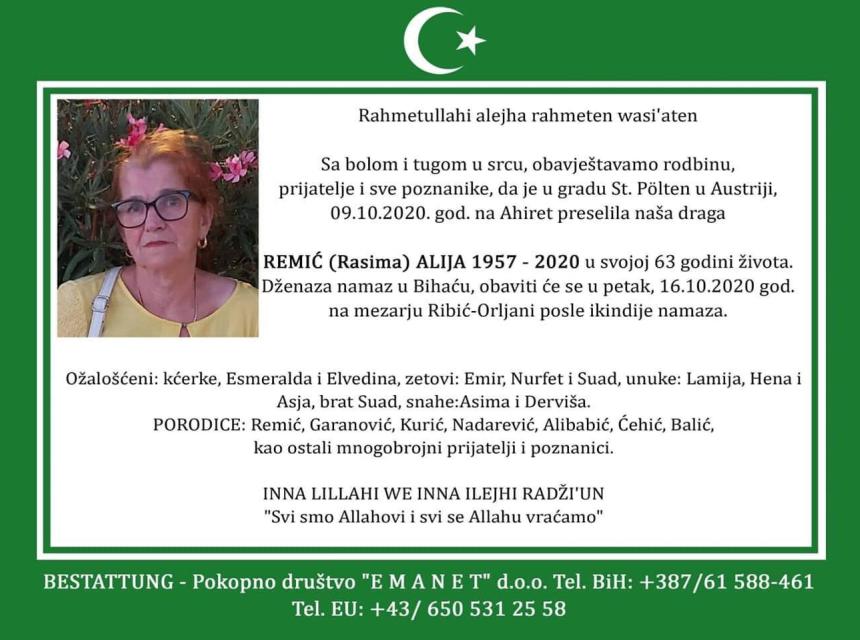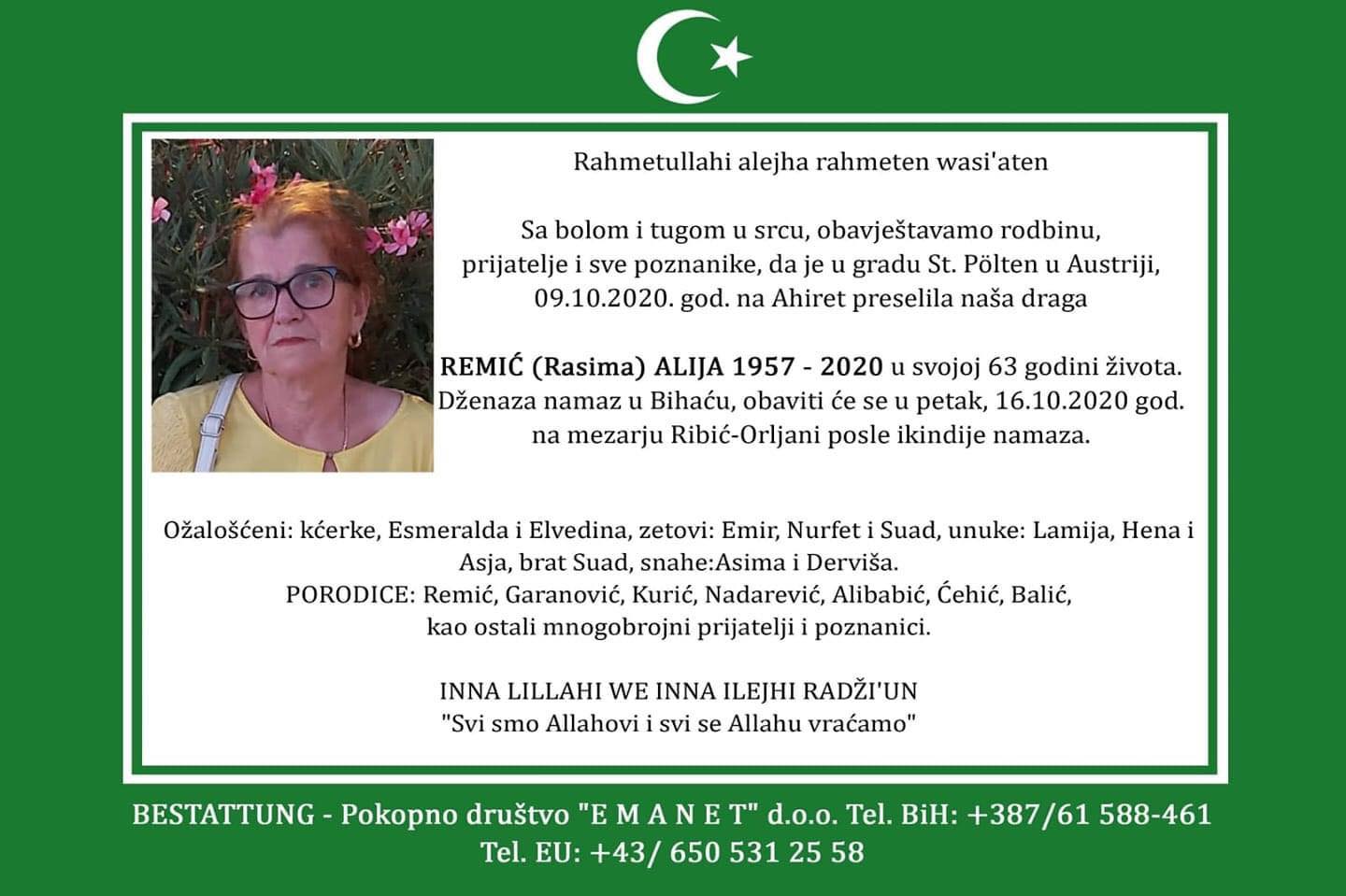 Tužnog srca i s bolom u duši obavještavamo rodbinu, komšije i prijatelje da je naša draga Remić (Rasima) Alija preselila na Ahiret, dana 9. oktobra 2020. godine u 63. godini života.