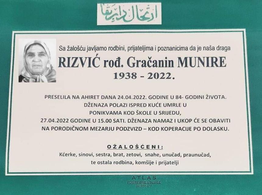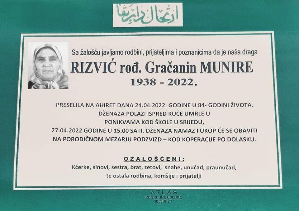 Tužnog srca i s bolom u duši obavještavamo rodbinu, komšije i prijatelje da je naša draga Rizvić (rođ. Gračanin) Munire u 84. godini života preselila na Ahiret.