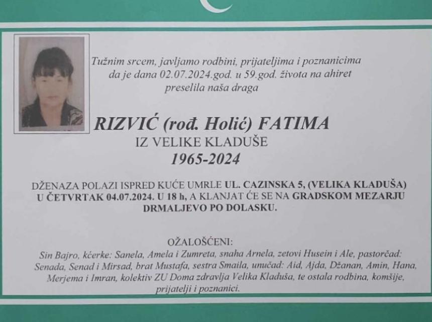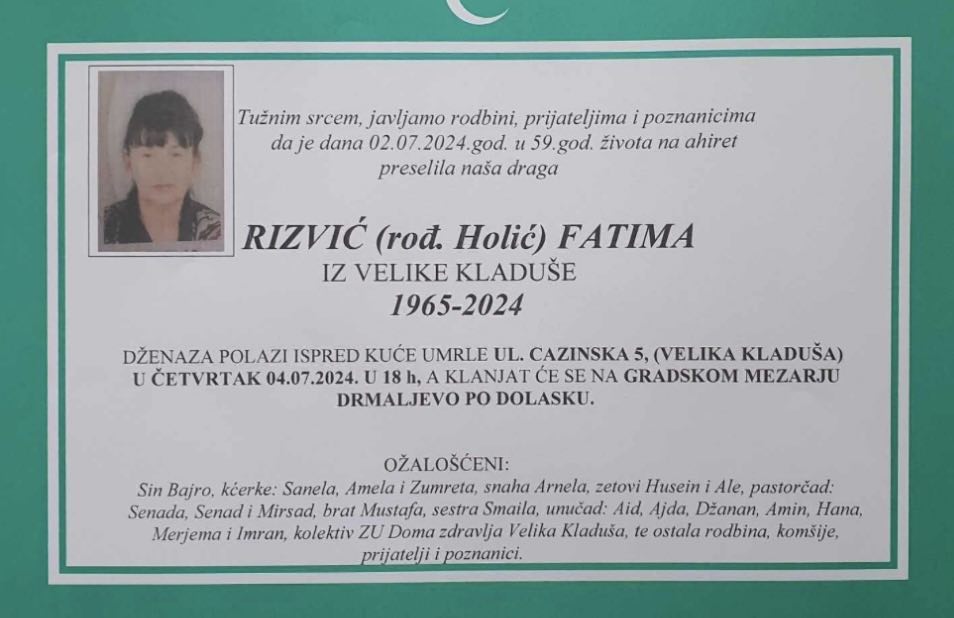 Tužnim srcem i bolom u duši javljamo rodbini, prijateljima i komšijama da je naša draga Rizvić (rođ. Holić) Fatima, dana 02.07.2024. godine u 59-oj godini života, preselila na Ahiret.