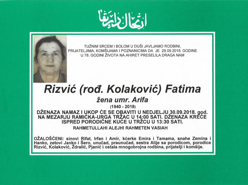 Tužnim srcem i bolom u duši javljamo rodini, prijateljima, komšijama i poznanicima da je dana 29.09.2018.godine u 78-oj. godini života na Ahiret preselila Rizvić (rođ.Kolaković) Fatima.