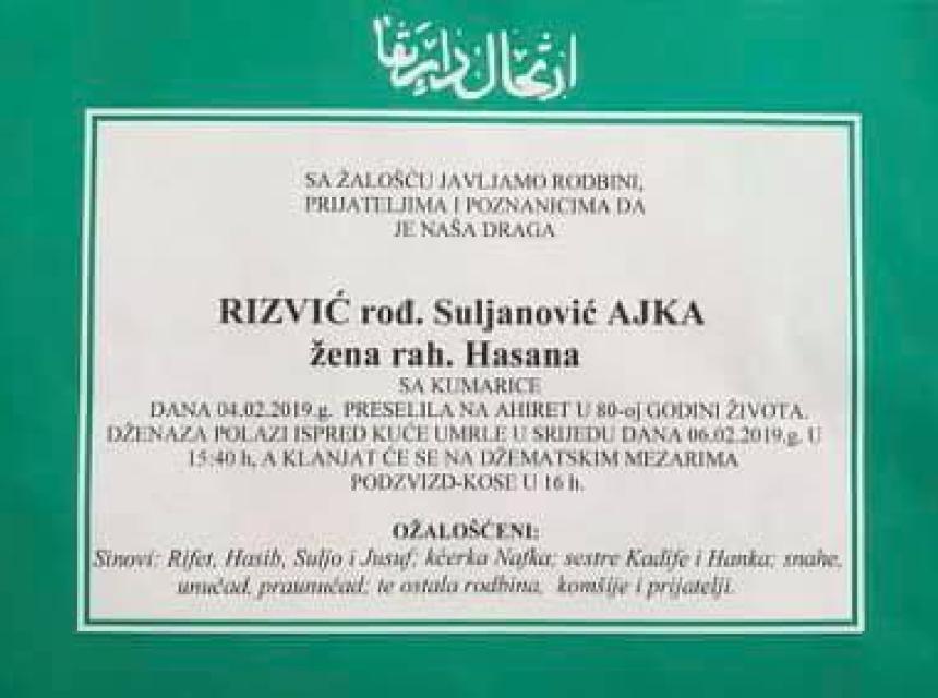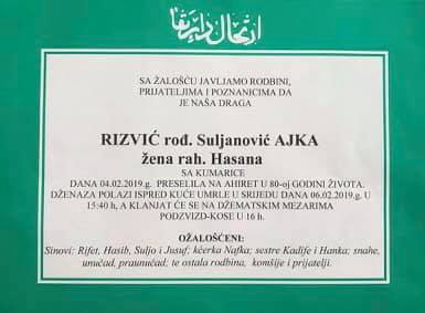 Sa žalošću javljamo rodbini, prijateljima i poznanicima da je naša draga Rizvić (rođ.Suljanović) Ajka, žena rah. Hasana dana 04.02.2019. godine u 80.-oj godini života preselila na Ahiret.