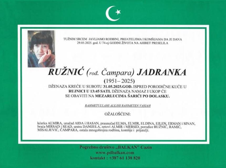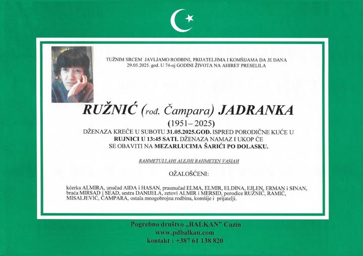 Dženaza polazi ispred kuće umrle u Rujnici u subotu, 31.05.2025. godine u 13:45 sati, a klanjat će se na mezarju Šarići po dolasku.