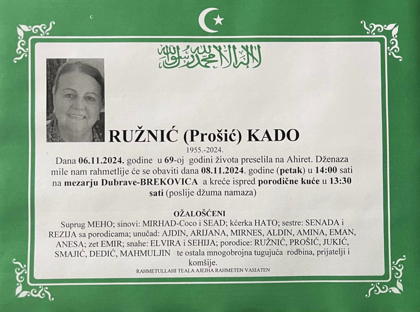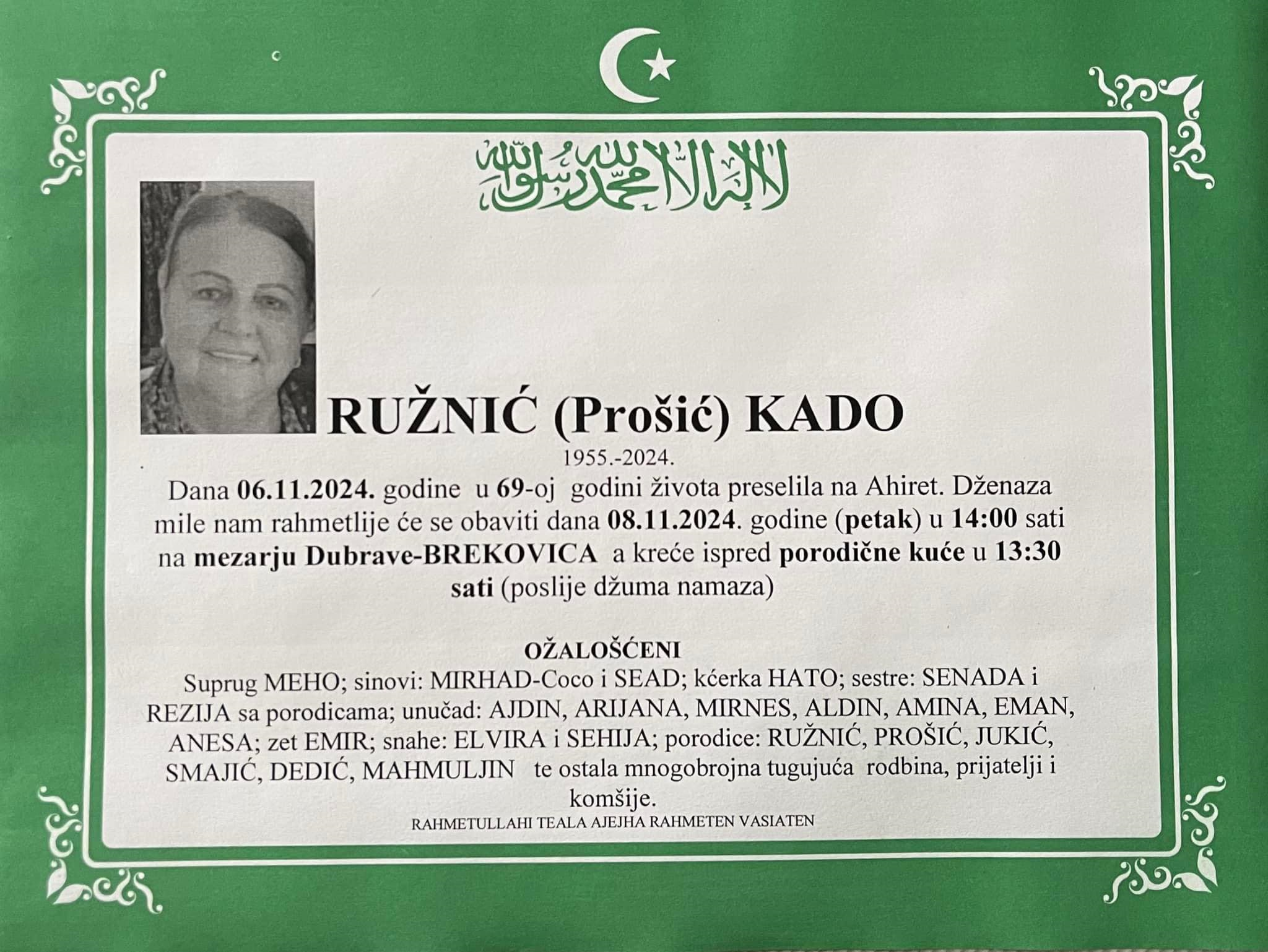 Obavještavamo rodbinu i prijatelje da je 06.11.2024. godine na ahiret u 69-oj godini života preselila Ružnić (rođ. Prošić) Kado.
