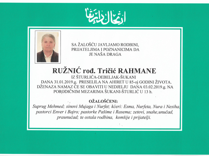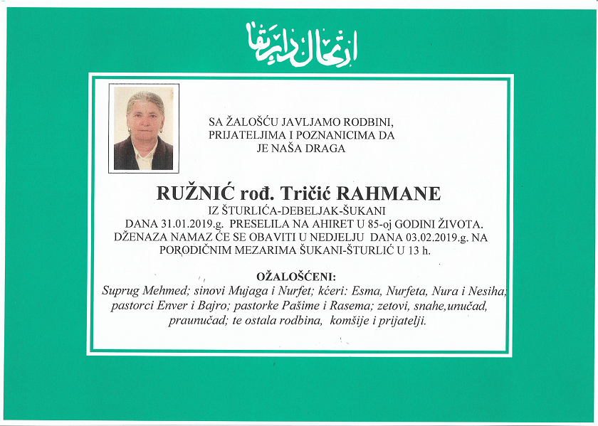Javljamo rodbini, prijateljima i poznanicima da je dana 31.01.2019.g. u 85-oj godini života na Ahiret preselila Ružnić rod. Tričić Rahmane iz Šturlića.
