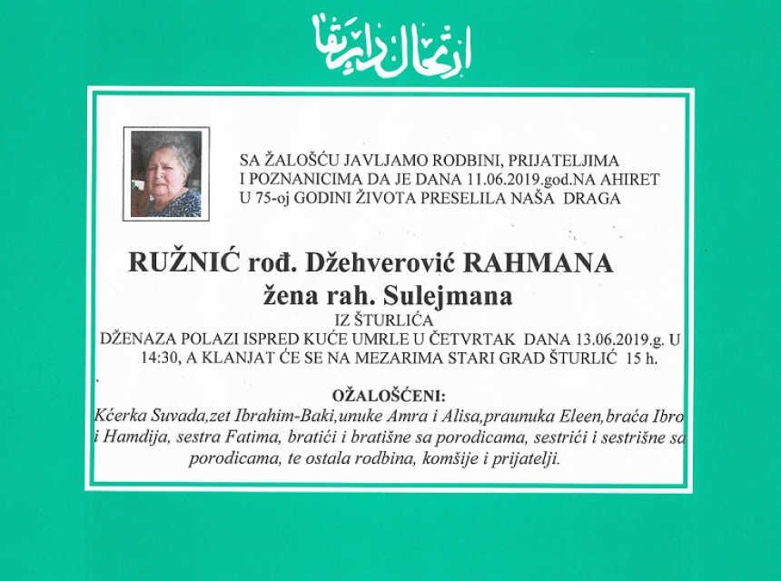 Sa žalošću javljamo rodbini, prijateljima i poznanicima da je dana 11.06.2019 godine u 75.oj godini života na Ahiret preselila naša draga Ružnić (rođ.Džehverović) Rahmana, žena rahmetli Sulejmana.