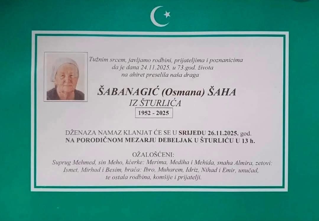 Dženaza namaz klanjat će se u srijedu 26.11.2025. godine na porodičnom mezarju Debeljak u Šturliću u 13 h.