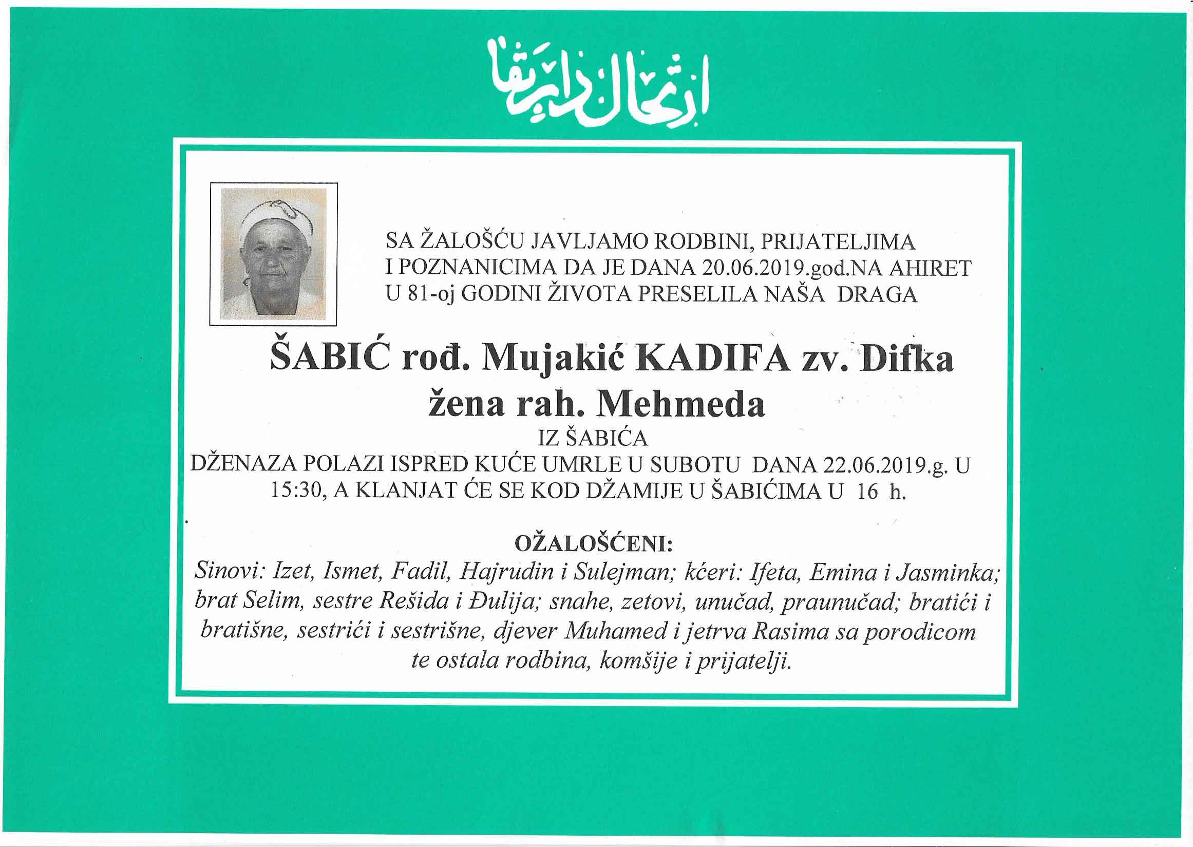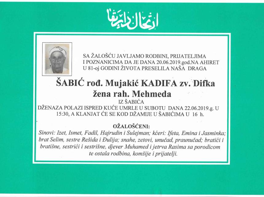 Tužnim srcem i bolom u duši javljamo rodbini, prijateljima, komšijama i poznanicima da je dana 20.06.2019. god. u 81-oj godini života na Ahiret preselila naša draga Šabić rođ. Mujakić Kadifa zv. Difka žena rah. Mehmeda