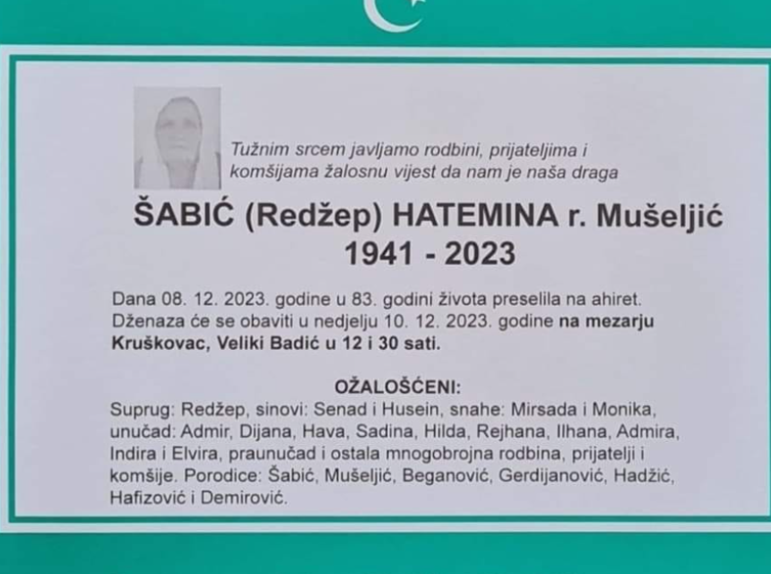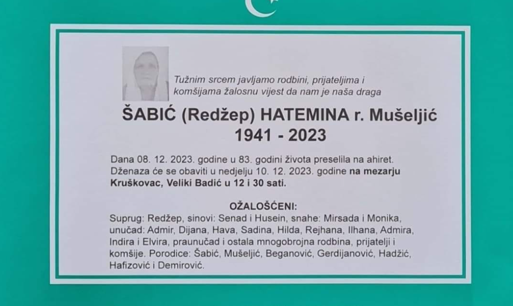 Tužnim srcem javljamo rodbini, prijateljima i komšijama žalosnu vijest da nam je naša draga ŠABIĆ (Redžep) HATEMINA r. Mušeljić dana 08. 12. 2023. godine u 83. godini života preselila na Ahiret.