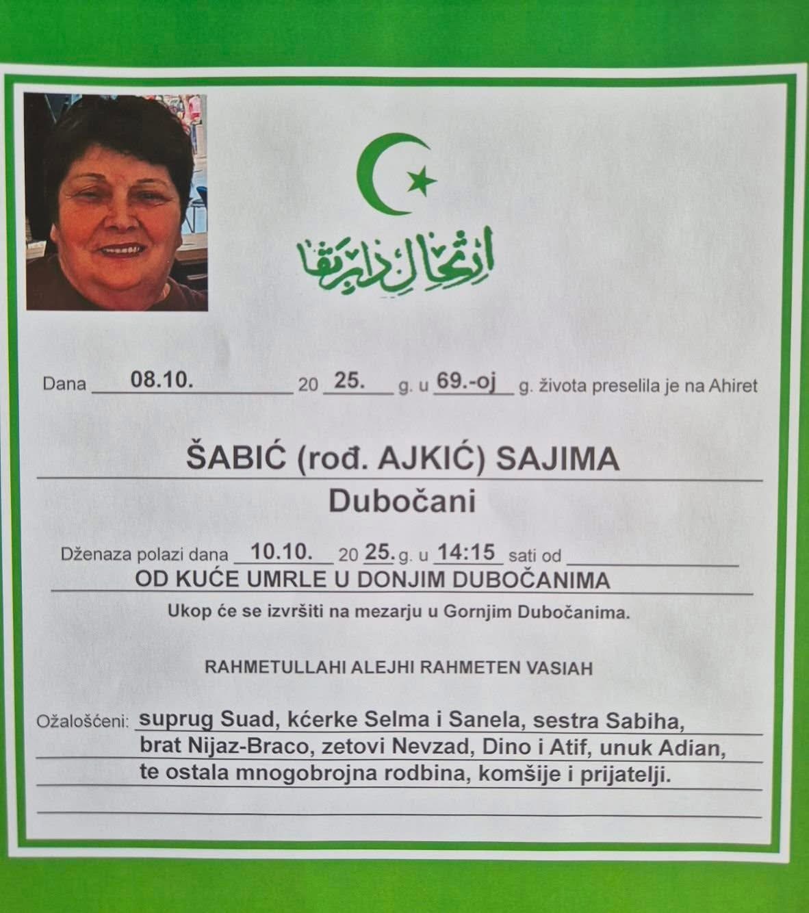 Dženaza polazi dana petak 10.10.2025. godine u 14:15 sati od kuće umrle u Donjim Dubočanima.