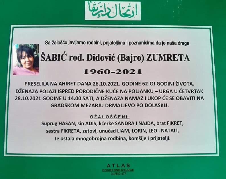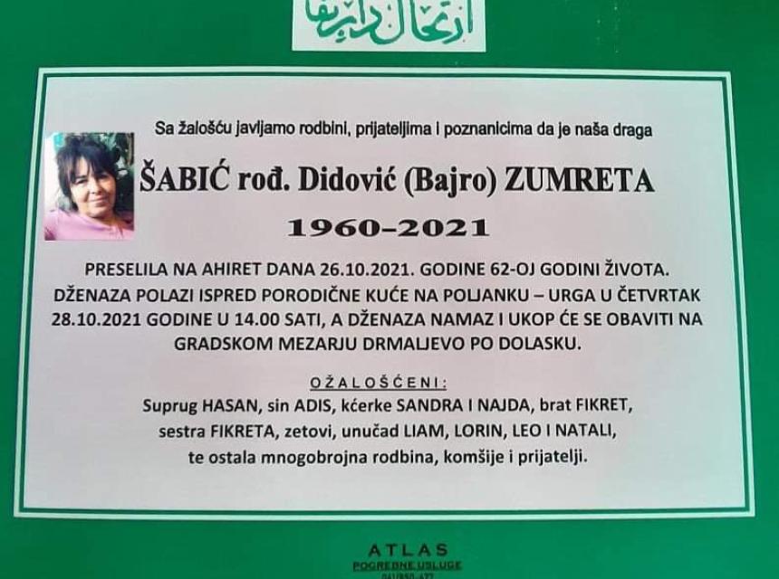 Tužnog srca i s bolom u duši obavještavamo rodbinu, komšije i prijatelje da je naša draga Šabić rođ. Didović (Bajro) Zumreta dana 26.10.2021. u 62. godini života preselila na ahiret.