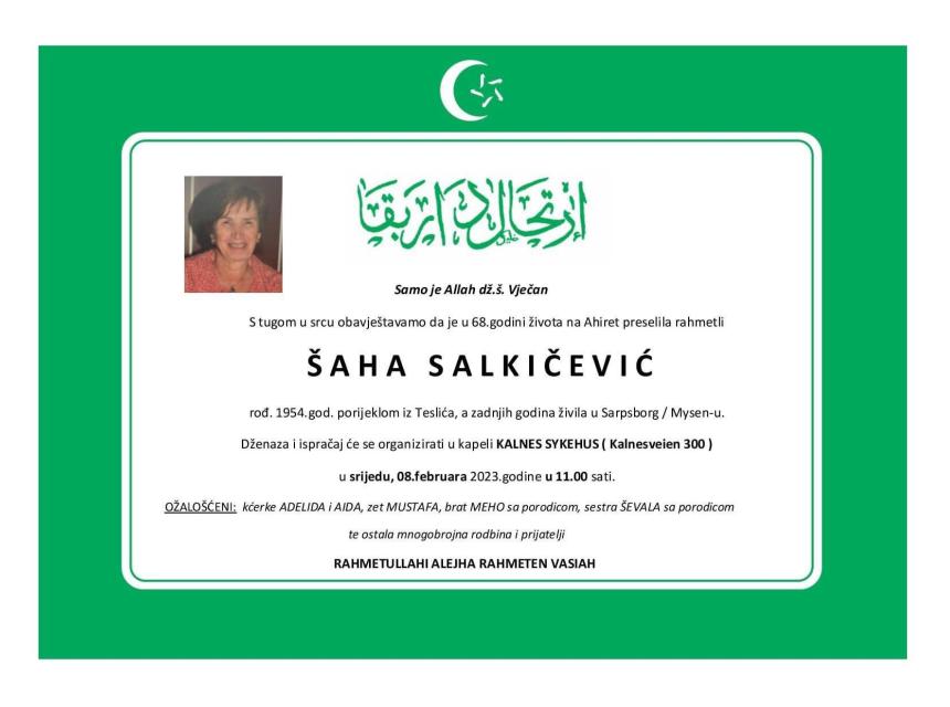 Tužnim srcem i bolom u duši obavještavamo rodbinu, prijatelje i komšije da je naša draga Šaha Salkićević u 68-oj godini života preselila na Ahiret.
