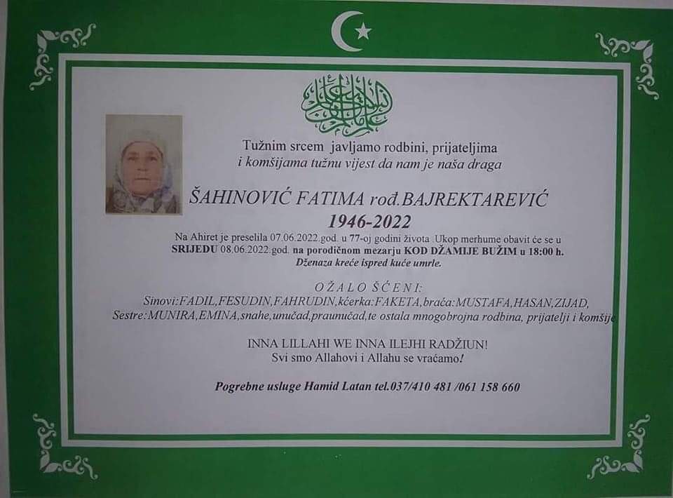 Tužnog srca i s bolom u duši obavještavamo rodbinu, komšije i prijatelje da je naša draga Šahinović Fatima rođ. Bajrektarević u 77. godini života preselila na Ahiret.