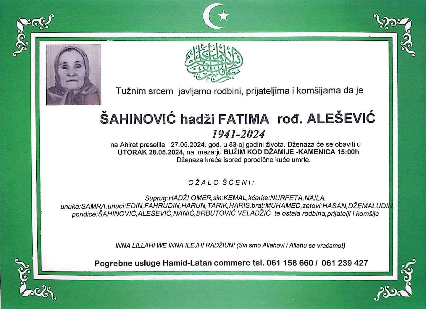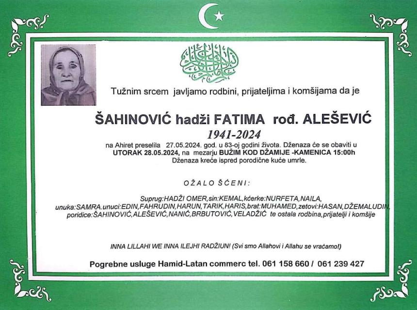 Tužnim srcem javljamo rodbini, prijateljima i komšijama da je Šahinović hadži Fatima rođ. Alešević dana 27.05.2024. godine na ahiret preselila u 83-oj godini života.