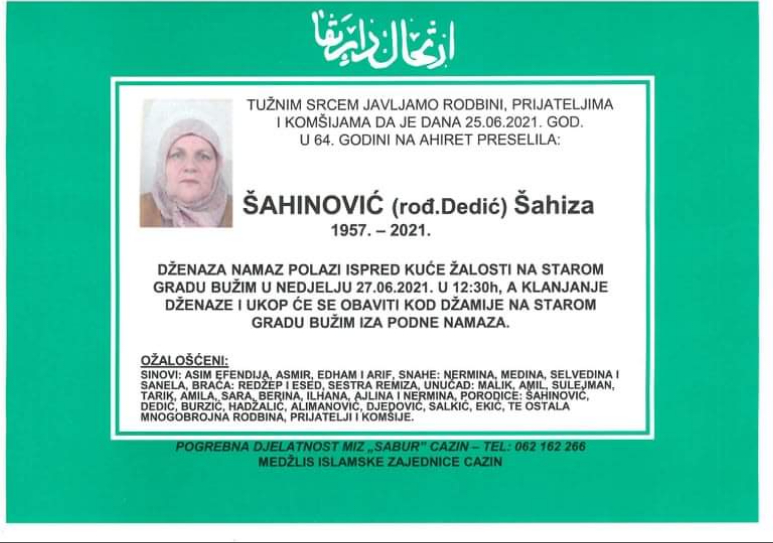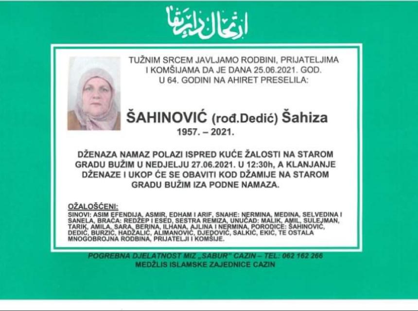Tužnog srca i s bolom u duši obavještavamo rodbinu, komšije i prijatelje da je naša draga Šahinović (rođ. Dedić) Šahiza dana 25.06.2021. godine, u 64. godini života, preselila na ahiret.
